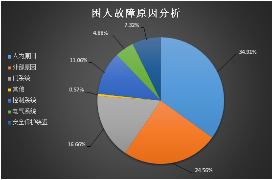 依据《电梯应急处置平台技术规范》(CPASE M001—2019),在人为原因、外部原因、门系统、曳引系统、导向系统、轿厢、控制系统、电气系统、安全保护装置九类故障中:人为原因故障(243起,占34.91%)、外部原因故障(171起,占24.56%)、门系统故障(116起,占16.66%)居前三位,其中生活(装修)垃圾导致开关门受阻困人199起、停电困人89起、门锁失效73起。