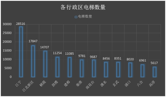 南京市12个行政区在用电梯分布情况如下,其中江宁区电梯数量最多28516台;高淳区电梯数量最少5617台。