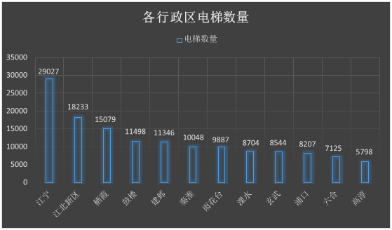 南京市12个行政区在用电梯分布情况如下,其中江宁区电梯数量最多29027台;高淳区电梯数量最少5798台。