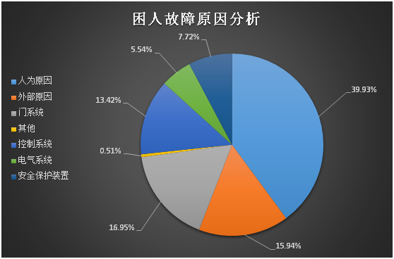 依据《电梯应急处置平台技术规范》(CPASE M001—2019),在人为原因、外部原因、门系统、曳引系统、导向系统、轿厢、控制系统、电气系统、安全保护装置九类故障中:人为原因故障(238起,占39.93%)、门系统故障(101起,占16.95%)、外部原因故障(95起,占15.94%)居前三位,其中生活(装修)垃圾导致开关门受阻困人210起、停电困人37起、门锁失效59起。