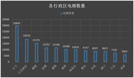 南京市12个行政区在用电梯分布情况如下,其中江宁区电梯数量最多29843台;高淳区电梯数量最少5863台。