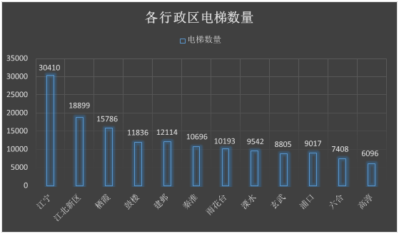 南京市12个行政区在用电梯分布情况如下,其中江宁区电梯数量最多30410台;高淳区电梯数量最少6096台。