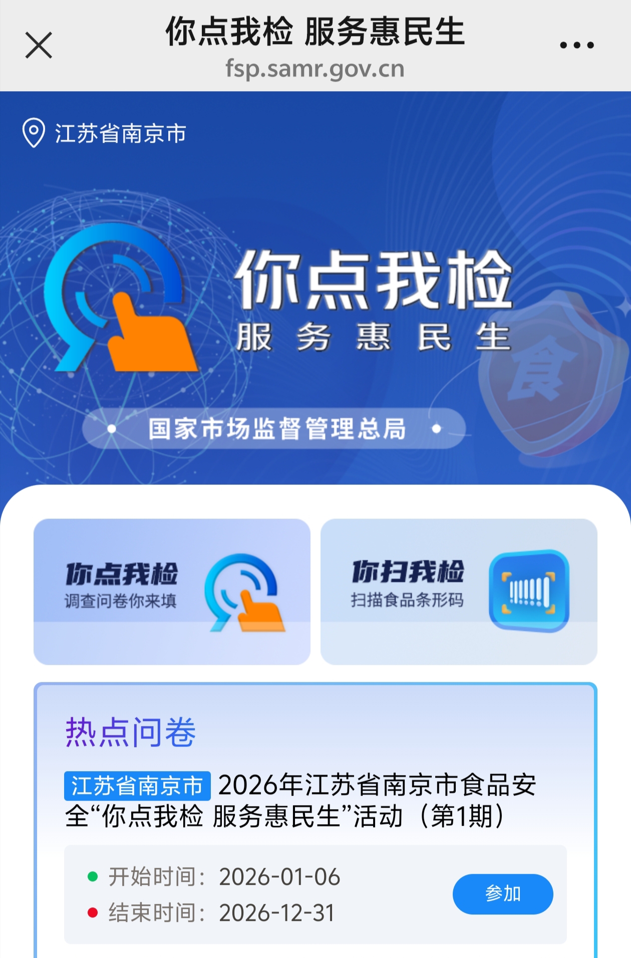 步骤二:选择热点问卷中的“2026年江苏省南京市食品安全“你点我检 服务惠民生”活动(第1期)”,进入“你点我检”意见征集页面。